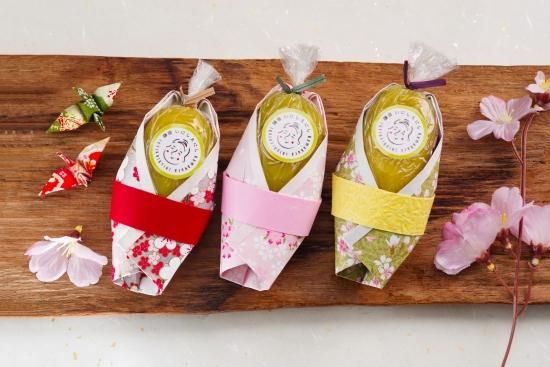 また、”花おなり”は季節の花々や時節由来の柄の和紙で、着物や浴衣に見立ててお包みしております。帯は五角形にあつらえ、縁